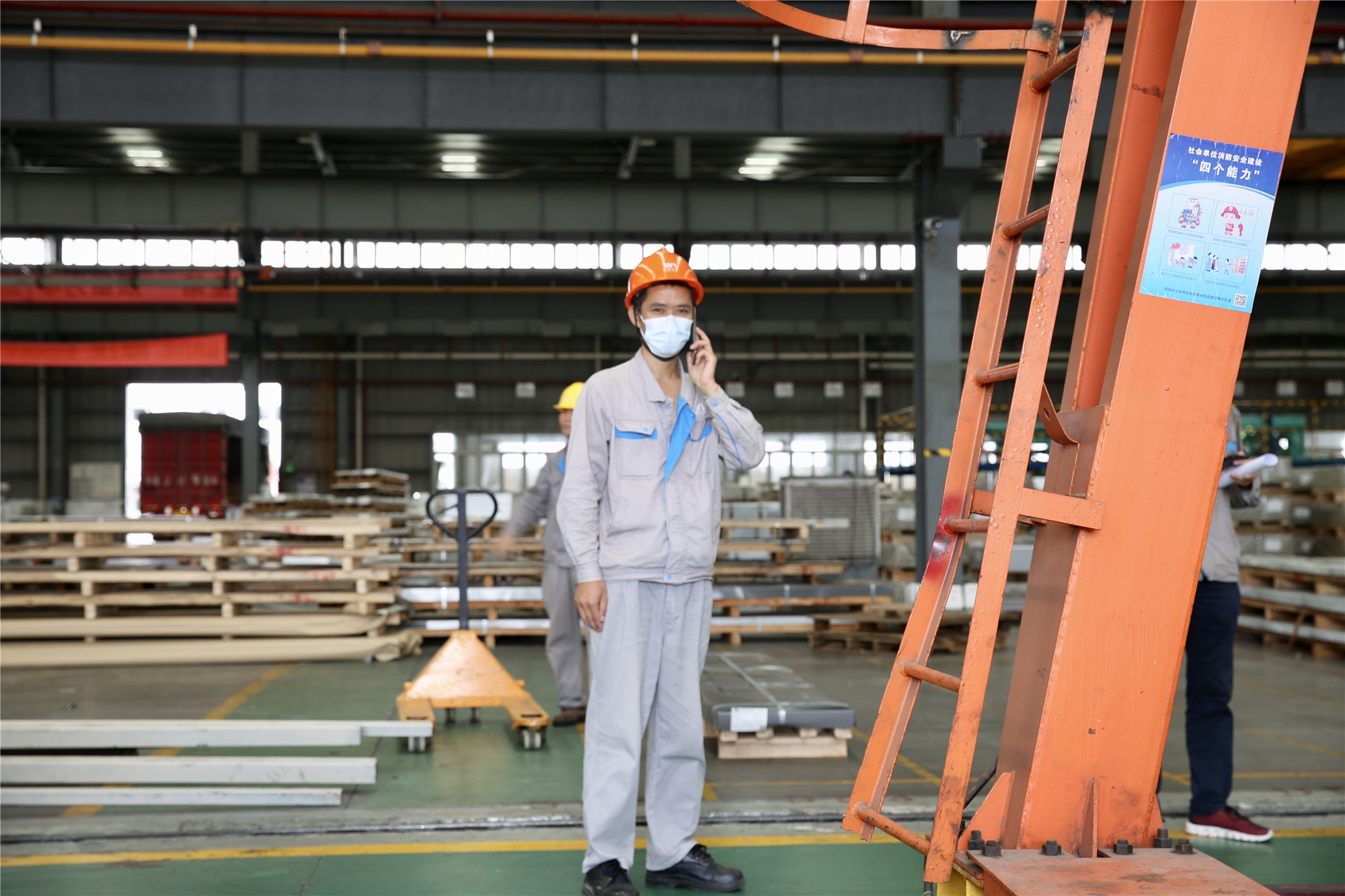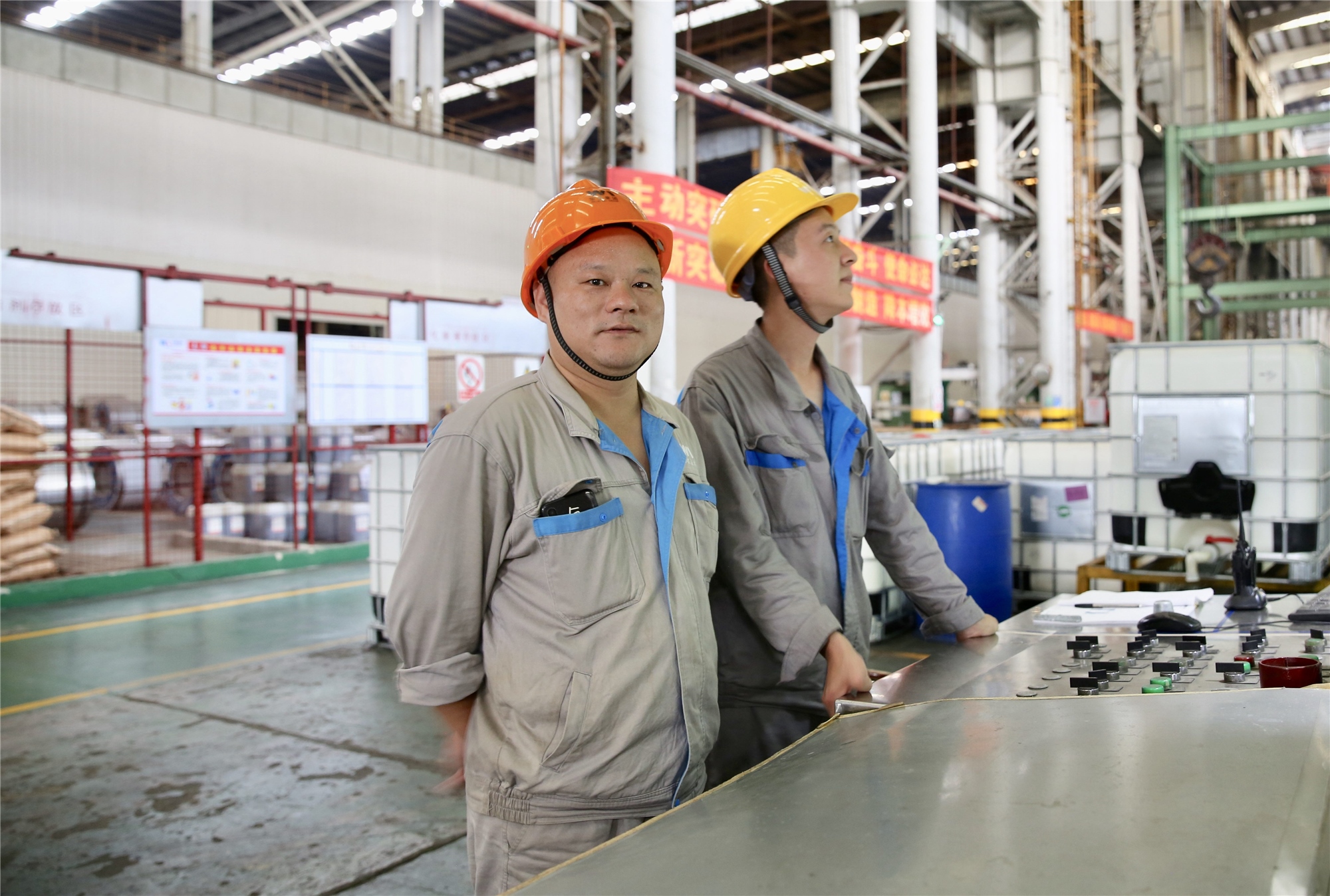 ▲ 殷國軍(左)在鍍鋅車間接受采訪