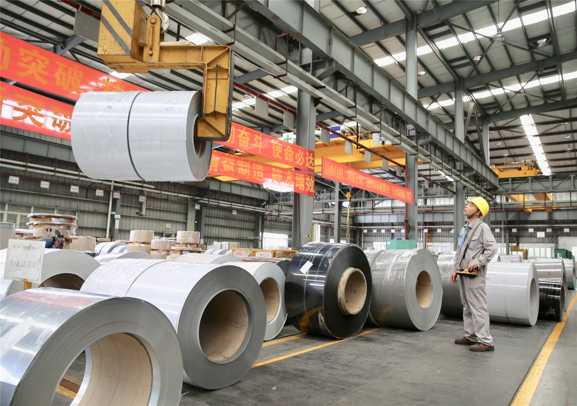 ▲ 車間掛著部門的誓師口號,一名員工在搬運扎卷