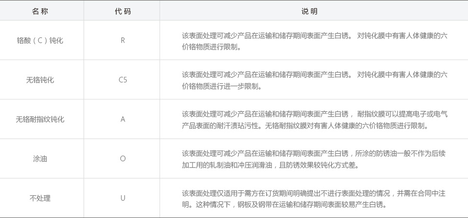 訂貨時(shí)用戶需提供:產(chǎn)品名稱(鋼板或鋼帶)、牌號(hào)、表面處理方式、表面質(zhì)量級(jí)別、重量、包裝方式等信息;選擇產(chǎn)品牌號(hào)及表面處理方式時(shí)請(qǐng)確認(rèn)或驗(yàn)證產(chǎn)品使用時(shí)的成型要求、沖壓要求、防腐要求、防止因所訂牌號(hào)和表面處理方式對(duì)應(yīng)的產(chǎn)品性能不滿足加工要求。